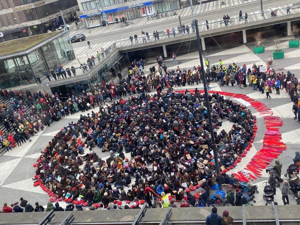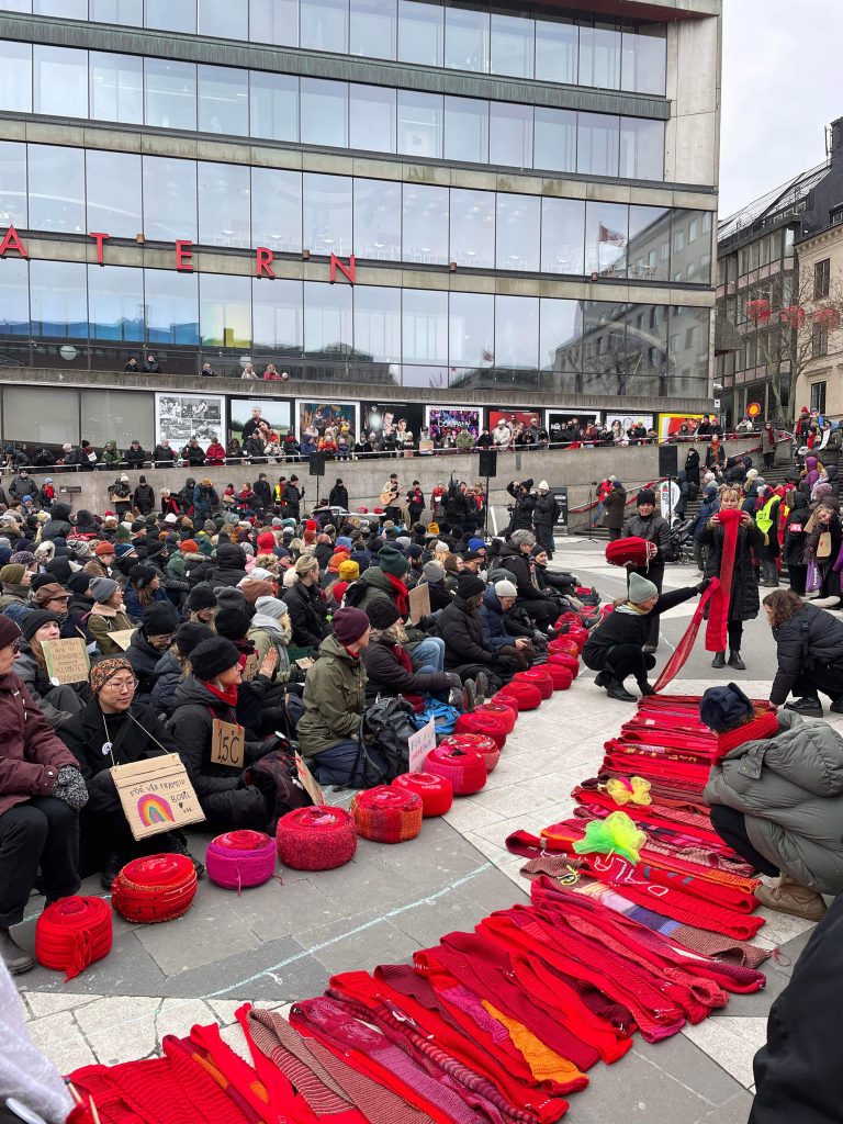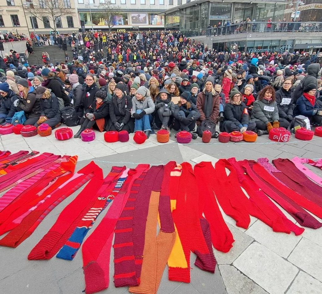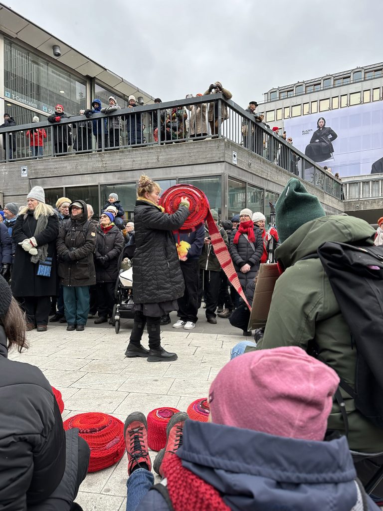 Samtidigt som rebellmammor tågade genom Stockholm genomfördes manifestationer på flera andra orter i Sverige och massor av statyer i flera städer och lokalt kläddes i röda halsdukar med hälsningar från Rebellmammorna. För många fler bilder och filmer, se ”Stickprojektets” Instagram.
