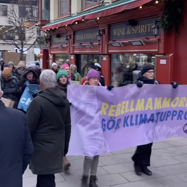 Rebellmammorna i Stockholm marscherade tillsammans med Fridays For Future den 3 mars 2023, i protest mot bankernas finansiering av fossilindustrin.