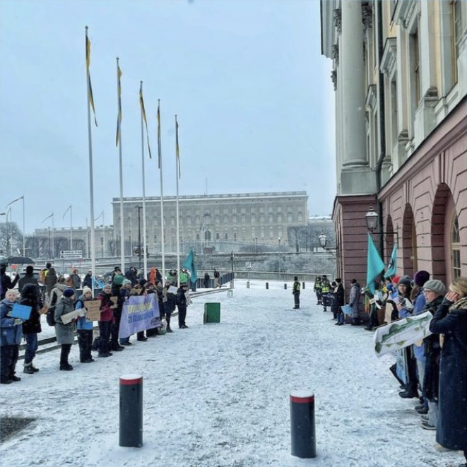 Rebellmammorna tillsammans med Rebellpapporna och Greenpeace utanför UD i Stockholm den 22 februari 2023.