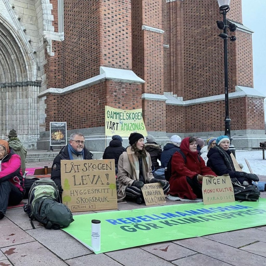 Rebellmammor demonstrerar för den svenska skogen på kyrkomötet i Uppsala den 20 november, 2023.