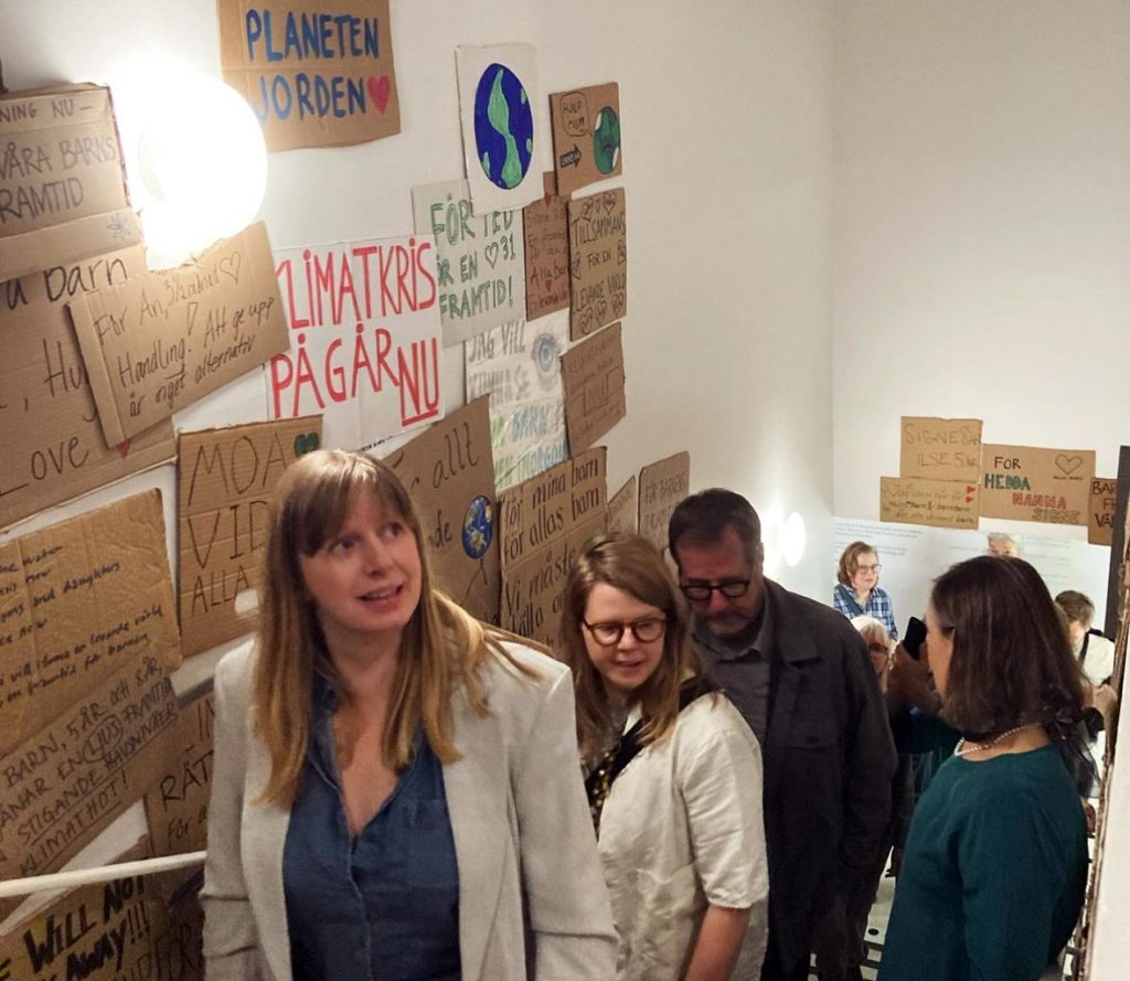 Rebellmammorna medverkade vid öppnandet av Moderna Museet Malmös utställning med eko-feministiska konstnären Monica Sjöö. Skyltar från våra manifestationer klädde in en hel trappuppgång. Malmö, 25 mars, 2024.
