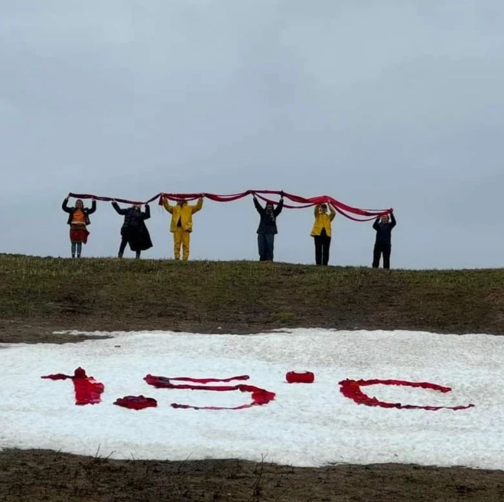 Rebellmammor på Ekerö manifesterar för 1.5-gradersmålet, med delar av den röda halsduken och kvarvarande snö.